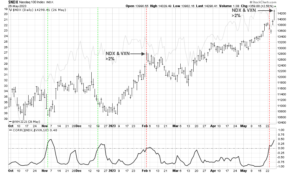 还需要关注的是下图中那条垂直的红色标记线,这是之前的卖出信号。当十日相关性变为正值时,就会出现买入信号,因为该指数及其波动率指数都在下跌(下图以绿色垂直线标注)。