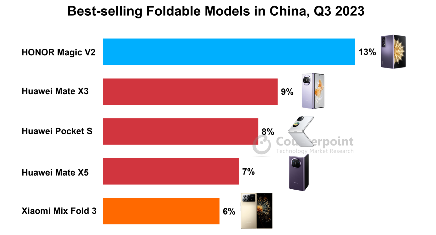 在Mate 60系列推出后,华为紧接着又发布了新一款折叠屏手机Mate X5,这款手机同样受到消费者的热捧。根据Counterpoint披露的数据,去年第三季度,也就是华为Mate X5推出没多久之后,该款手机就占据了7%市场份额。而在中国折叠屏手机销量前五中,华为就占了三席。
