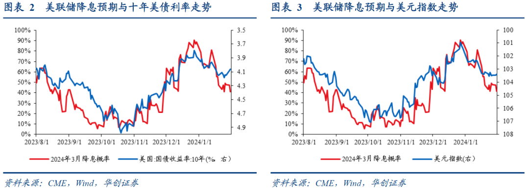 。1月中旬以来伴随部分联储官员偏硬表态,3月降息预期已有明显回调,降息概率在会前降至50%以下,十年美债利率和美元指数已有一轮反弹。从去年7月政策利率达峰以来,十年美债利率和美元指数的走势与降息预期高度反向同步(图2-3)。