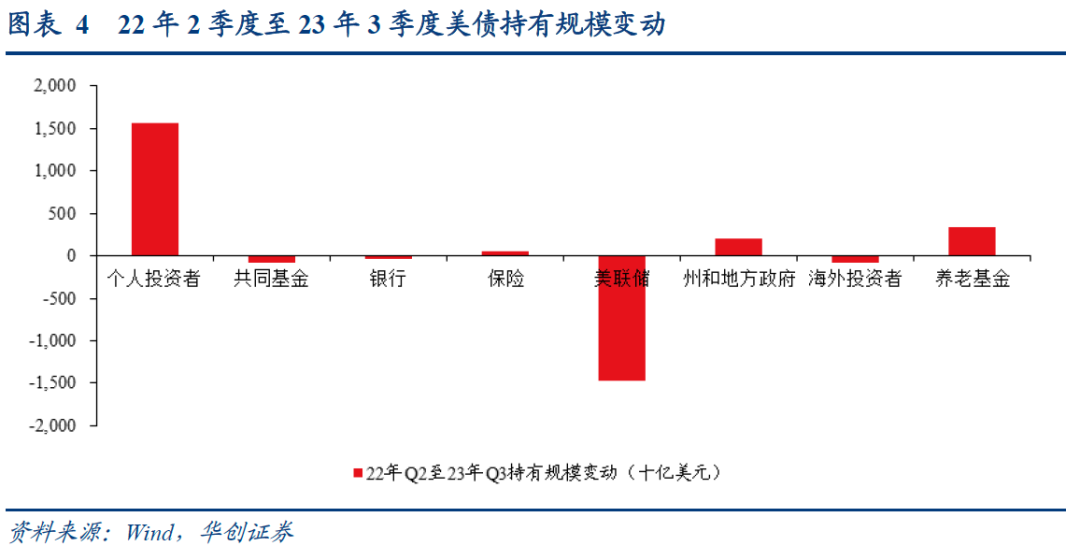 。从22年2季度至23年3季度(最新数据),美联储是美债市场最大的出售者,共同基金、银行和海外投资者也在小幅卖出;最大的边际买家则是个人投资者(主要是对冲基金),养老基金也有小幅增持。对冲基金购买美债主要以基差交易为主,美联储和美国证监会已开始关注其风险,基差交易的规模本身也超过了2018-19年,继续增长空间有限。美联储开始讨论放缓缩表,美债需求结构边际存在改善预期。