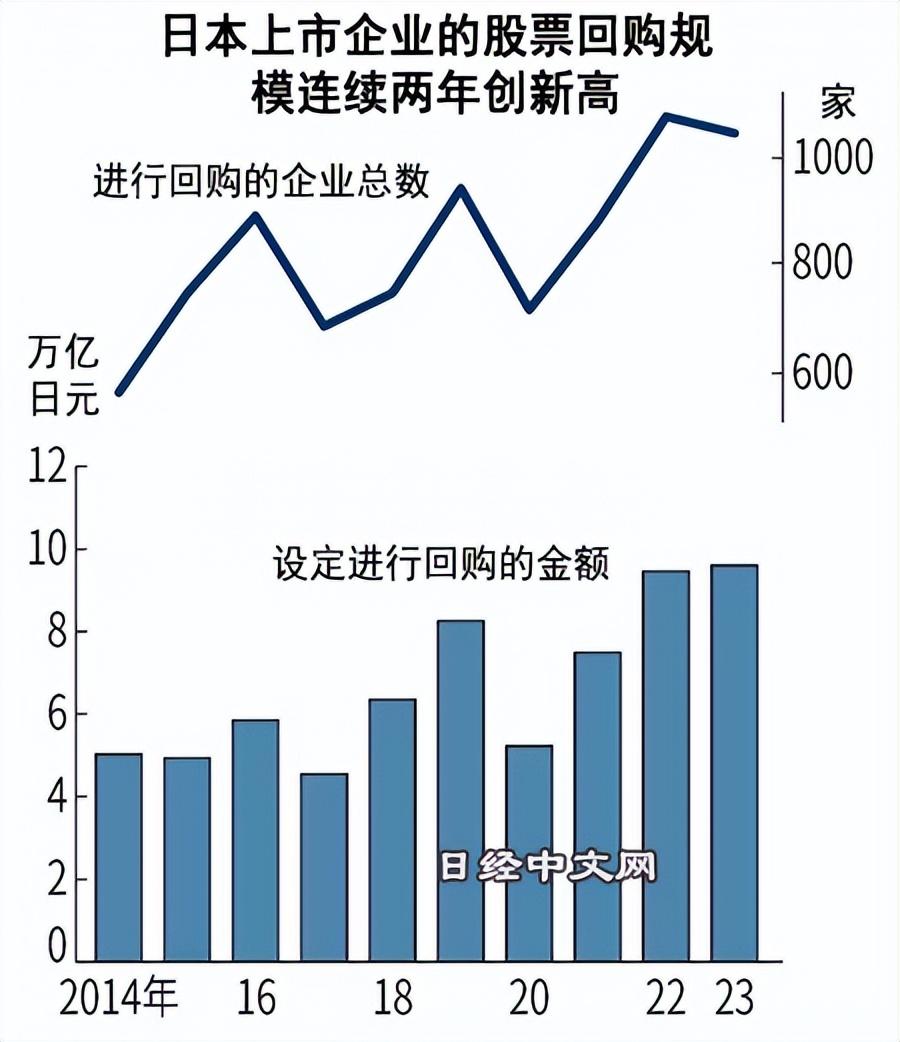而2023年,日本上市公司回购股票总额达到9.6万亿日元,比上一年增加了1350亿日元,已连续3年增加,设定回购计划的企业共有1033家。