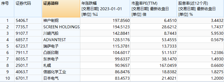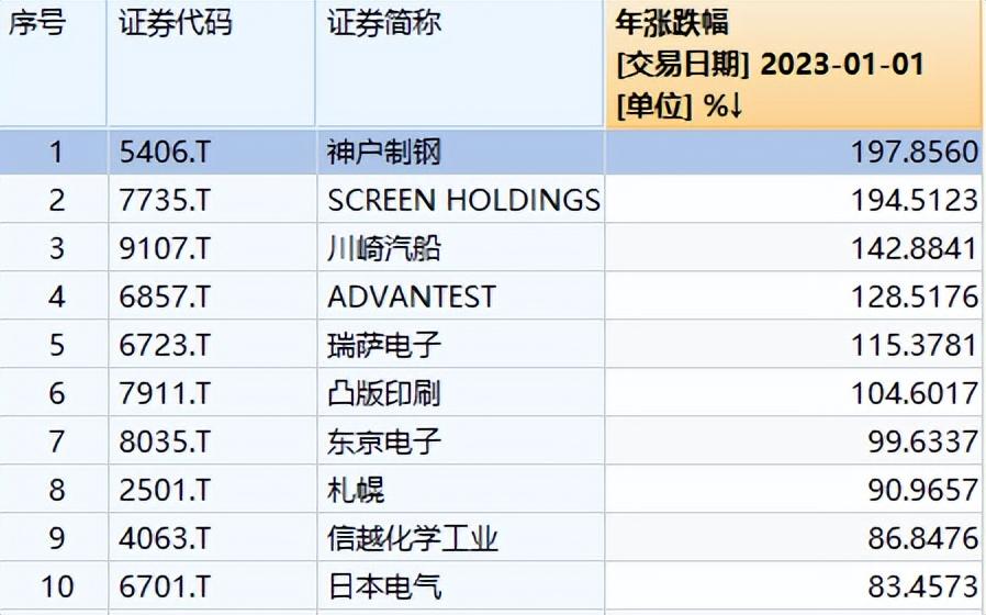 今天我们来统计2023年日本涨幅最大的前十只股票,看看从中国股市流出的资金,究竟在日本看中了哪些公司。