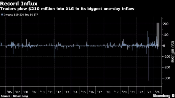 媒体汇编的数据显示,交易员周一向景顺标普500指数最优50 ETF(XLG)净注入2.1亿美元,这是该基金近20年历史上最大的单日资金流入。创纪录的资金流入推动该ETF的资产增长4%,达到53亿美元,其中近一半是在过去一年吸引的。