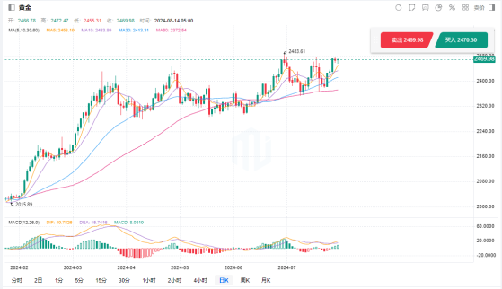 技术面上,黄金价格本周初呈现震荡上行,离历史高位2483美元只是一步之遥,金价短线走势转强,整体上涨趋势维持改变。日线图中各条均线呈现多头排列,表明市场多方力量增强。KD指标中,双线在50位置上方,并且双线向上运行,显示市场主动买盘力量增强。黄金价格整体可能会继续震荡上行,上方阻力位在2500美元。