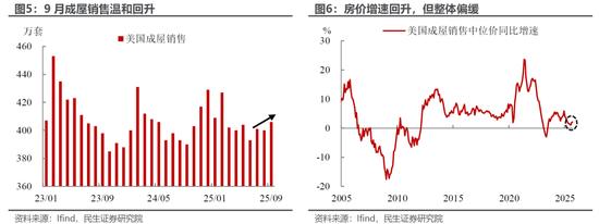 与此同时,也要进一步观察通胀的上行幅度。除了关税影响外,还需要关注降息对通胀的潜在助推作用,尤其是对地产等利率敏感部门的价格影响。当前来看,9月受抵押贷款利率的下行,成屋销售升至7个月以来的最高值,房价也有所回升,但整体增速依然偏缓,降息的刺激作用仍有待进一步观察。