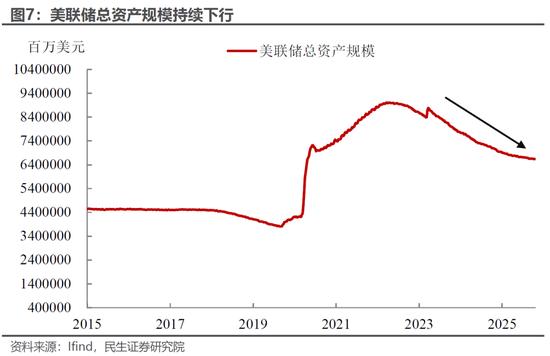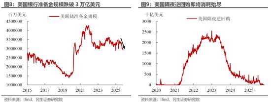 在降息之外,本次会议另一个看点,在于美联储在结束缩表上的表态:10月会议上,美联储公开表示将于12月1日结束资产负债表缩减。自本轮QT以来,美联储资产负债表规模持续收缩,已从峰值9万亿美元缩减至6.6万亿美元,近期银行系统准备金也跌破3万亿美元,创今年1月以来新低,货币市场流动性压力持续累积。