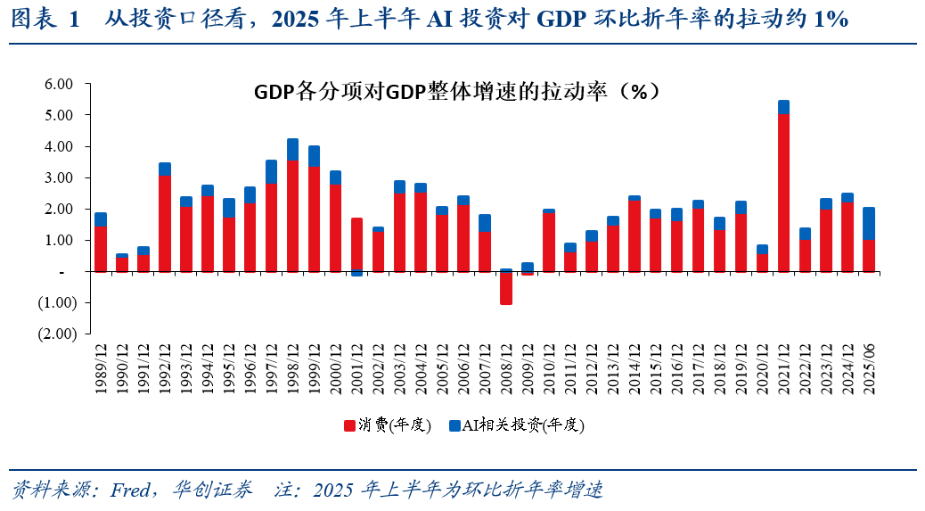 2025年上半年,从投资口径看,AI对经济的拉动显著。将GDP中的计算机投资、软件投资、电力与通讯投资三项归类为AI相关投资,则2025年上半年AI相关投资对GDP环比折年率的拉动率约1%,确实与消费对GDP的拉动率(约1.1%)基本持平。