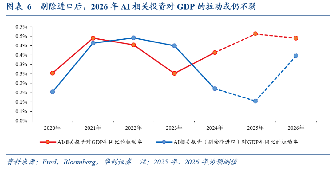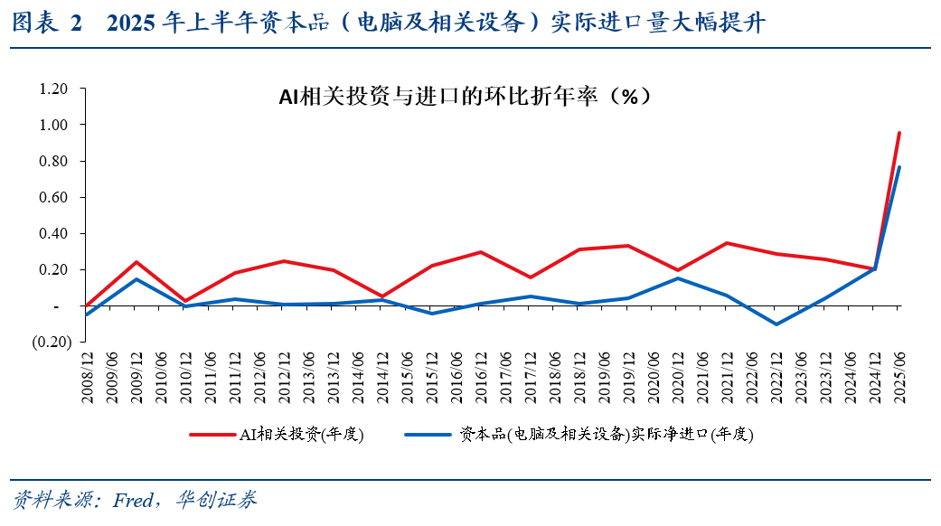 ① AI相关资本品投资来自于进口(例如企业投资建设服务器,但服务器来自于进口),那么企业投资会被记入投资分项,但资本品进口也会被记入进口分项,形成对GDP的减项。可以看到,2025年上半年受到关税带来抢进口的影响,资本品(电脑及相关设备)实际进口量大幅提升。因此我们估算可得,2025年上半年剔除资本品(电脑及相关设备)实际净进口对GDP的负向拉动,则AI相关投资对GDP环比折年率的拉动率为0.2%。