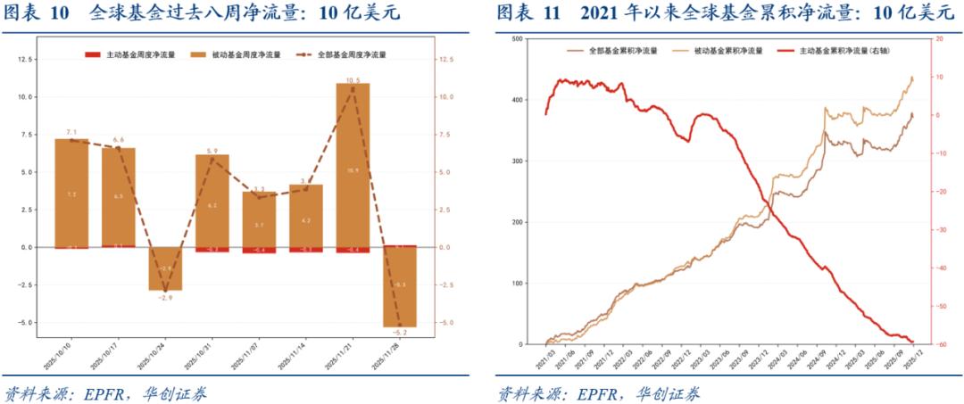 自2025年9月以来,全球资金对中国股市的流向发生逆转,显示出投资者信心的恢复。2025年9月、10月和11月,全球基金净流入中国股票(包括在岸及离岸)分别为176、170和125亿美元。而在2024年11月至2025年8月的10个月间,全球基金则从中国股票净流出68亿美元。值得注意的是,资金流入的结构呈现出显著特征:被动型基金是本轮回流的主要驱动力,而同期主动基金仍继续流出。