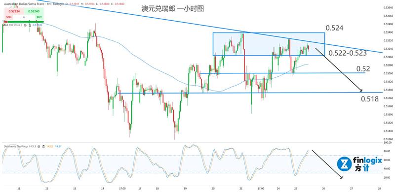 技术面: 100均线微微向上,澳瑞已经有筑底迹象,不过上方还未完全摆脱趋势线和前高点压制。因此可以考虑高位做空,空单入场可以考虑0.522-0.523区间,配合随机指标超买区死叉提高入场胜率。如果突破0.525则说明汇率已经转为上涨趋势。