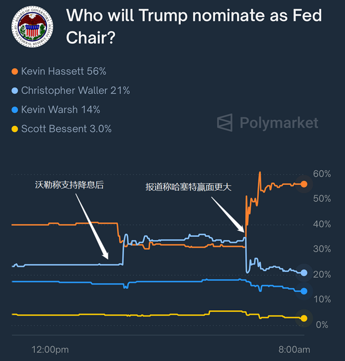 根据最新的Polymarket数据,哈塞特Hassett当选的可能性昨日飙升至最高(56%),其次是沃勒Waller(21%),然后是沃什(14%)。