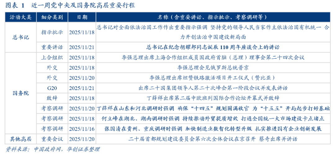 近一周(11月16日-23日),党中央及国务院高层重要行程,参见如下表格。