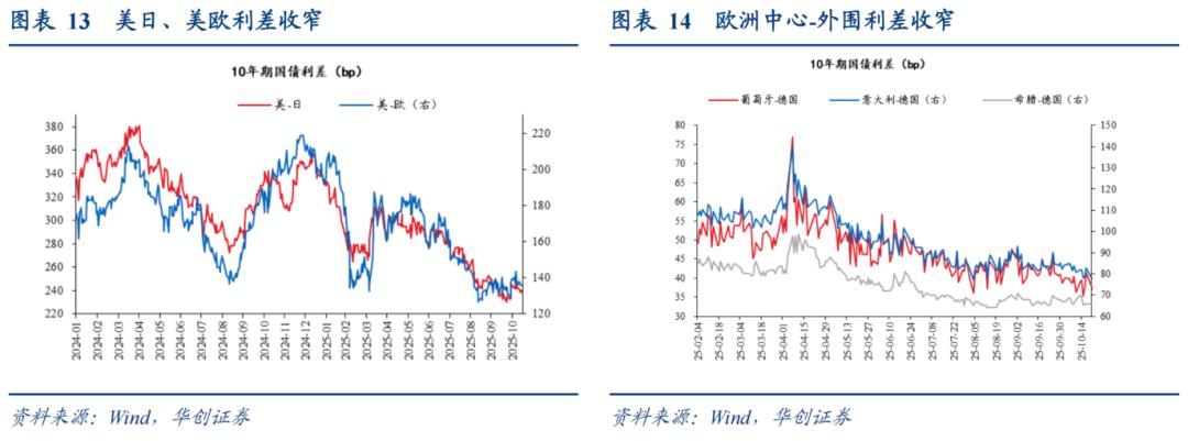 美日、美欧利差收窄。11月13日,10年期美日国债利差为240.5bp,上周四为241.6bp。11月13日,10年期美欧国债利差为136bp,上周四约为137.7bp。