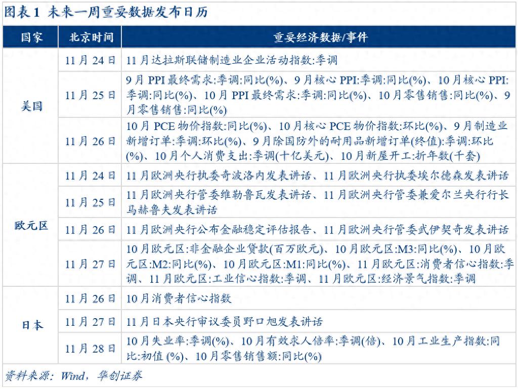 美欧、美日国债利差收窄。11月20日,10年期美欧国债利差为129bp,较一周前收窄7bp。11月20日,美日利差为228bp,较一周前收窄15bp。