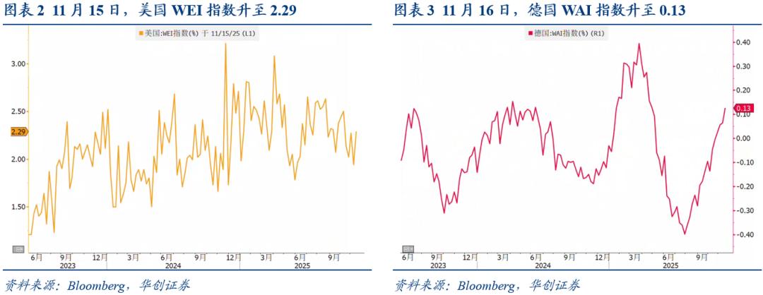 美国经济活动回升。11月15日当周,美国WEI指数升至2.29,上周为1.94。德国经济活动回升。11月16日当周,德国WAI指数升至0.13,上周为0.06。