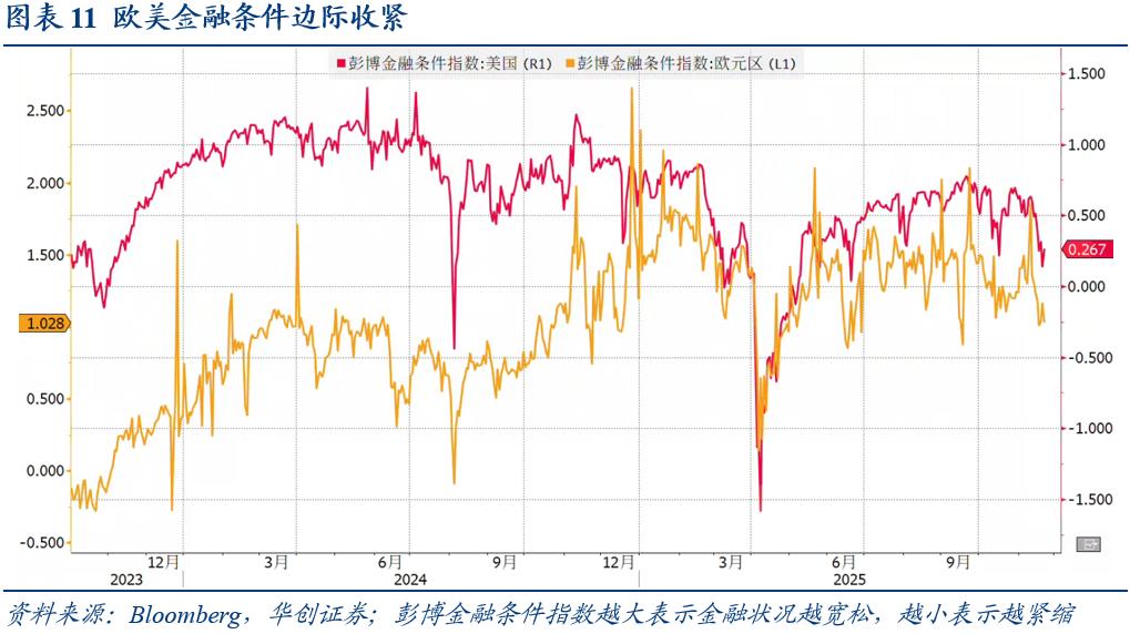 欧美金融条件指数下行。11月21日,美国、欧元区金融条件指数分别为0.267、1.028,一周前分别为0.511、1.237,两周前分别为0.514、1300。