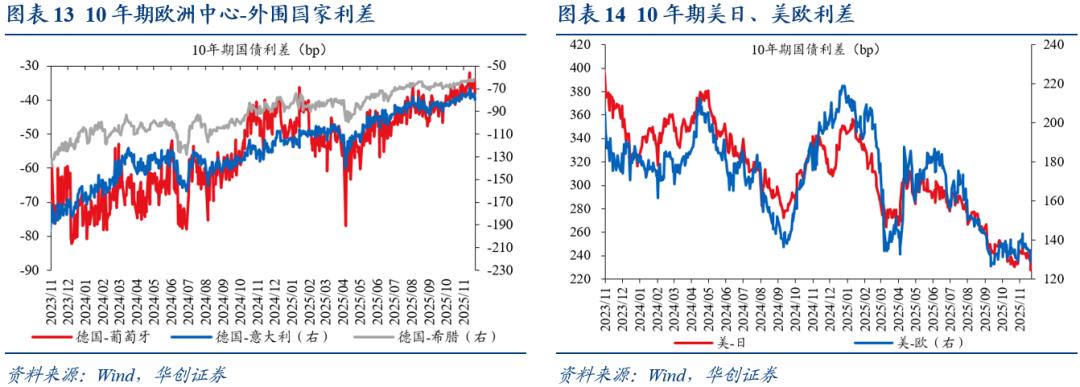 欧洲中心-外围国家利差走阔。11月21日,德国与葡萄牙、意大利10年期国债利差分别为-38bp、-79bp,一周前分别为-35bp、-76bp。