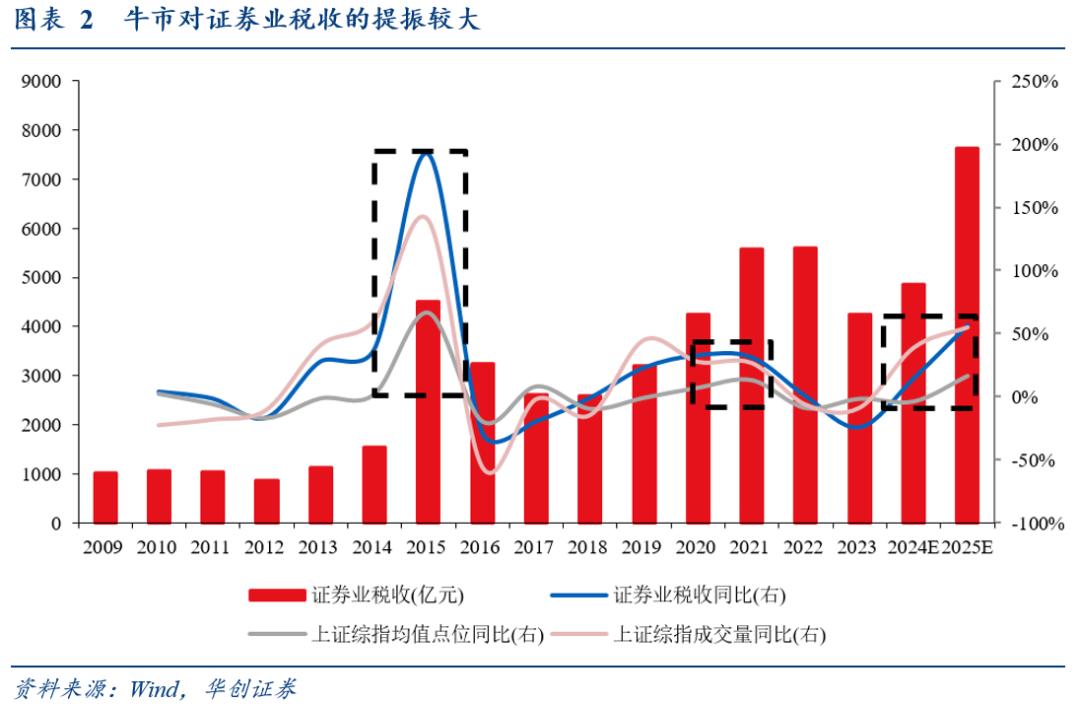 第一步,测算2024年资本市场相关行业税收约4900亿:根据《中国税务年鉴2024》,2023年资本市场服务业(证券业)税收收入为4243亿。从税收构成来看,增值税与企业所得税是证券业税收的主体,两者增速均与行业利润增速高度关联:企业所得税直接以企业利润为税基计税,利润增速可直接反映其增长趋势;增值税方面,依据财税〔2016〕36号文,“金融商品转让按照卖出价扣除买入价后的余额为销售额”,而该交易价差是证券业利润的核心组成部分,因此利润增速亦能间接体现增值税增速。基于此,我们参考申万证券行业上市公司利润增幅,并作出以下假设:一是 2024 年非上市券商利润增速与申万证券行业上市公司增速保持一致,二是证券业整体税收增速与行业利润增速同步。据此测算,2024 年证券业税收金额或约为 4864 亿元。