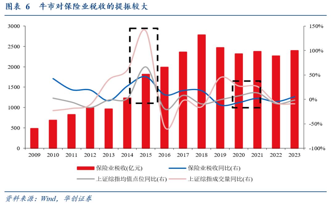 此外,牛市驱动保险业、非金融企业投资收益(不符合免税条件的股息红利、股票转让)增长,也能带来可观的税收增收(如,潜在企业所得税≈ (应税投资收益增长额 - 可弥补的以前年度亏损等抵扣项) ×适用税率(法定税率25%);受数据可得性所限,难以展开测算):