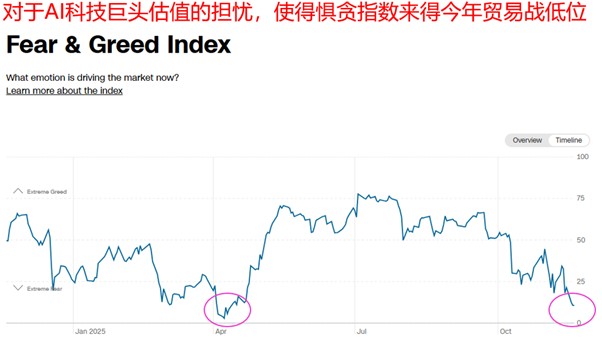 从当前的市场情绪来看,过去四个交易日似乎已经过度拉往悲观的极端,以CNN恐惧与贪婪指数来说,最新位置在11,这已经远低於极度恐惧的临界值(25),不止于此,就连CoinMarketCap统计的加密货币恐惧与贪婪指数也来到16的极度恐慌区间,各位回想一下,上次这样的情形发生在什么时候?公布答案,就是在今年四月美国总统提出对等关税审判日那时候,那时候市场一度也相当恐慌,但相信各位都知道行情发生何种情况?没错!就是大幅上涨,标普500指数与比特币纷纷创下历史新高。这次仅仅是因为老调重弹的AI过高估值就让情绪指数来到如此低的位置,要知道,现在标普500指数离历史新高还不到5%!