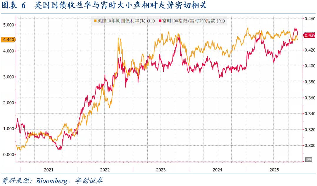 (五)英国国债收益率与富时大小盘相对走势密切相关