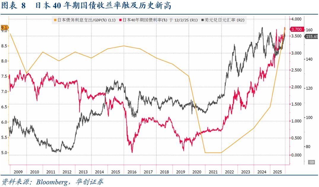 随着市场逐渐担忧高市早苗大规模经济刺激方案增加国债供给,日本长端国债收益率近期急剧攀升,40年期日本国债收益率一度触及3.745%的历史峰值。如何理解日本经济刺激计划推高国债利率的现象?投资者普遍担忧,日本GDP萎缩背景下推出25万亿日元的补充预算将恶化通胀和债务负担,“财政风险溢价”卷土重来。建议日本新财年的预算细节,或是决定日本长债收益率和日元走向的关键因素。