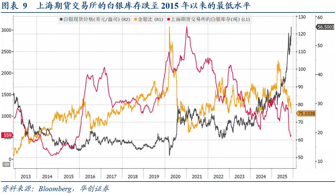 美联储降息预期、ETF资金流入以及实物供给短缺共同推动现货白银持续上涨,11月底现货白银价格达到56.5美元/盎司的历史新高,年内涨幅近90%。尽管伦敦市场因库存回流暂时缓解了压力,但全球实物短缺的矛盾转移至亚洲,上海期货交易所的白银库存跌至2015年以来的最低水平。同时,美国将白银列入关键矿物清单引发潜在的关税担忧,进一步加剧了全球结构性短缺,全球白银市场可能处于面临缺乏库存缓冲的脆弱时刻。
