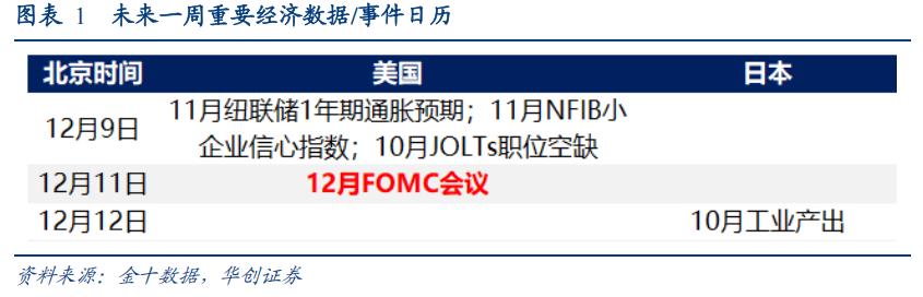 美日利差收窄。12月5日,10年期美日国债利差为218.9bp,上周为220.8bp。12月4日,10年期美欧国债利差为126.1bp,上周五约为124.6bp。