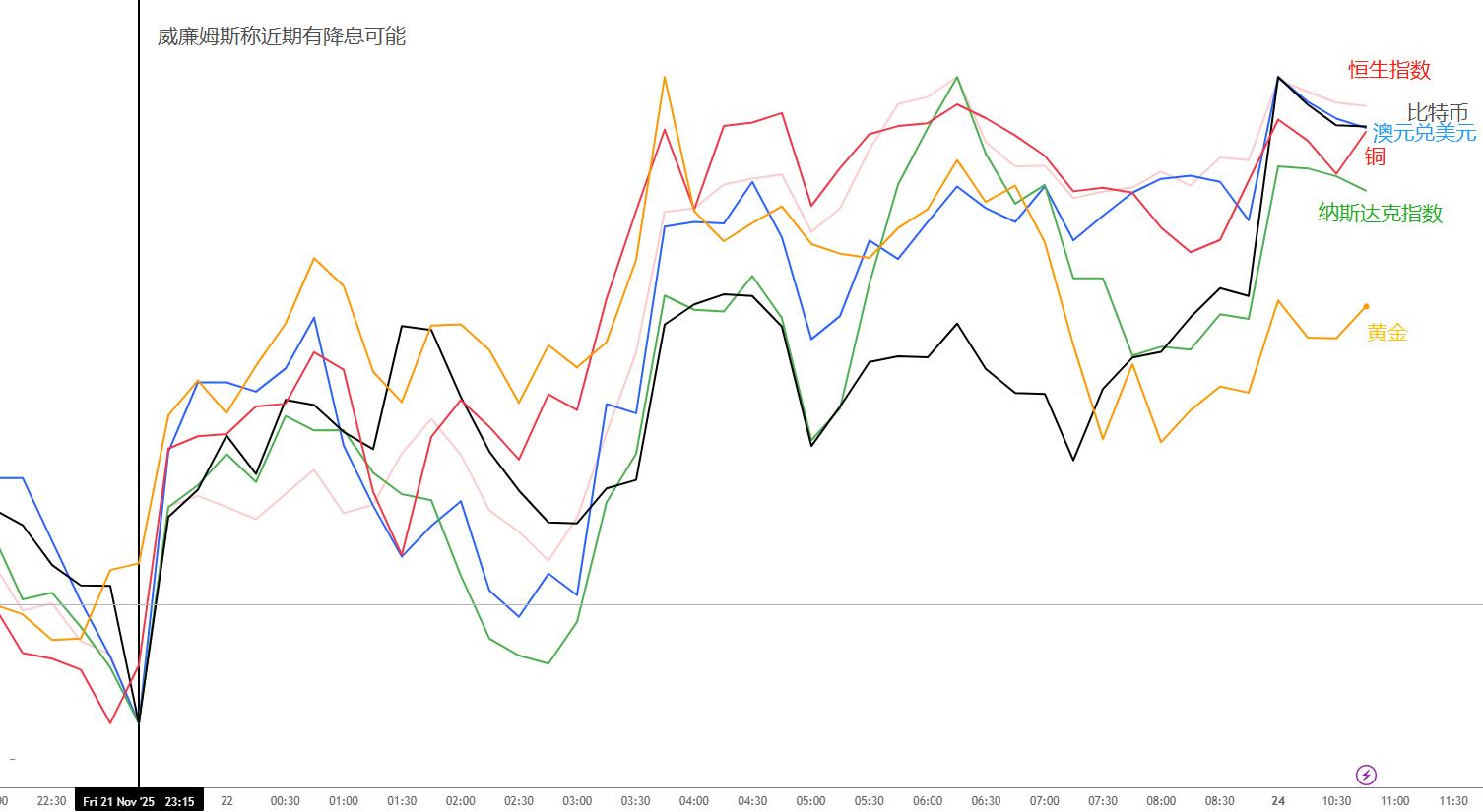 也就是在威廉姆斯讲话的同时,美股带领全球股市触底反弹,币圈、包括黄金在内的大宗商品澳元与纽元商品货币呈现完美同步上涨行情