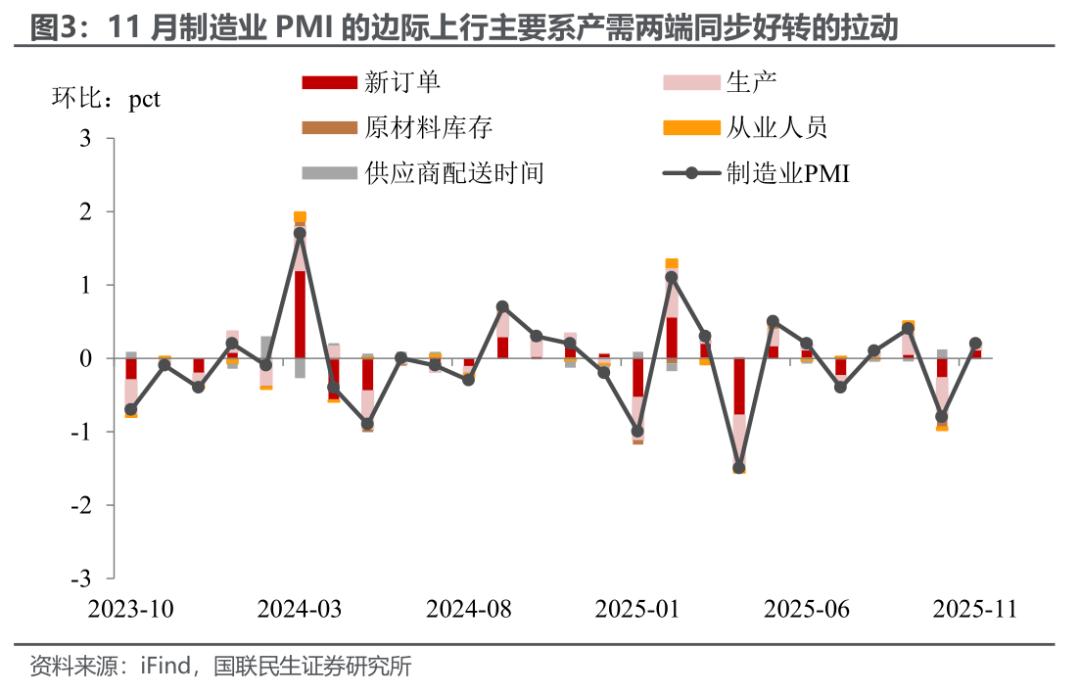 产需两端同步边际好转,但“需”更胜于“产”。11月制造业PMI的主要拉动项目,为细项数据中占比最大的PMI新订单指数及PMI生产指数。前者上升0.4pct、录得49.2%;后者上升0.3pct、录得50.0%。