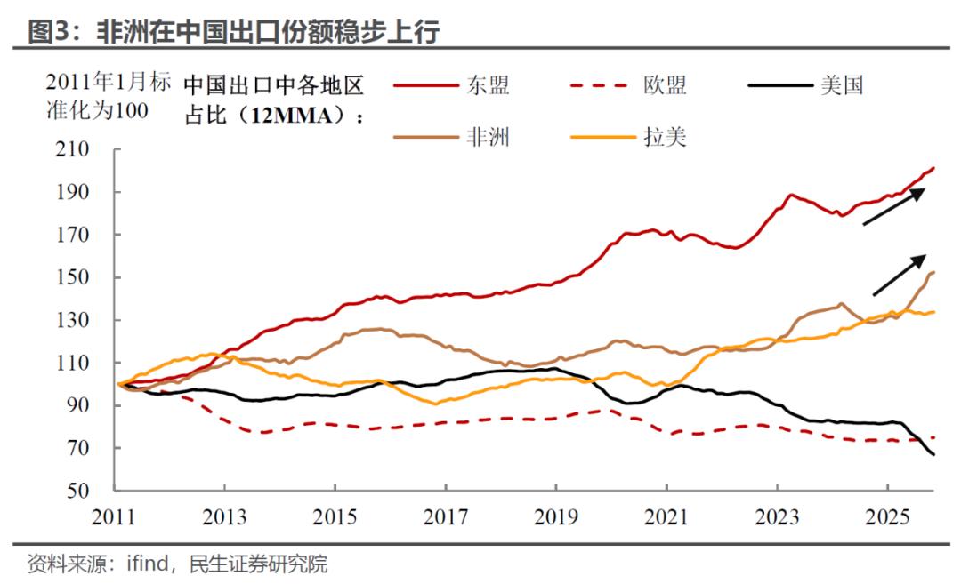 非洲经济温和复苏,贸易增长基础稳固。根据IMF预测,2026年撒哈拉以南非洲GDP增速由4.1%进一步回升至4.4%,经济需求依然强劲,叠加中国在非洲市场的加快布局,中非贸易有望继续得到支撑。
