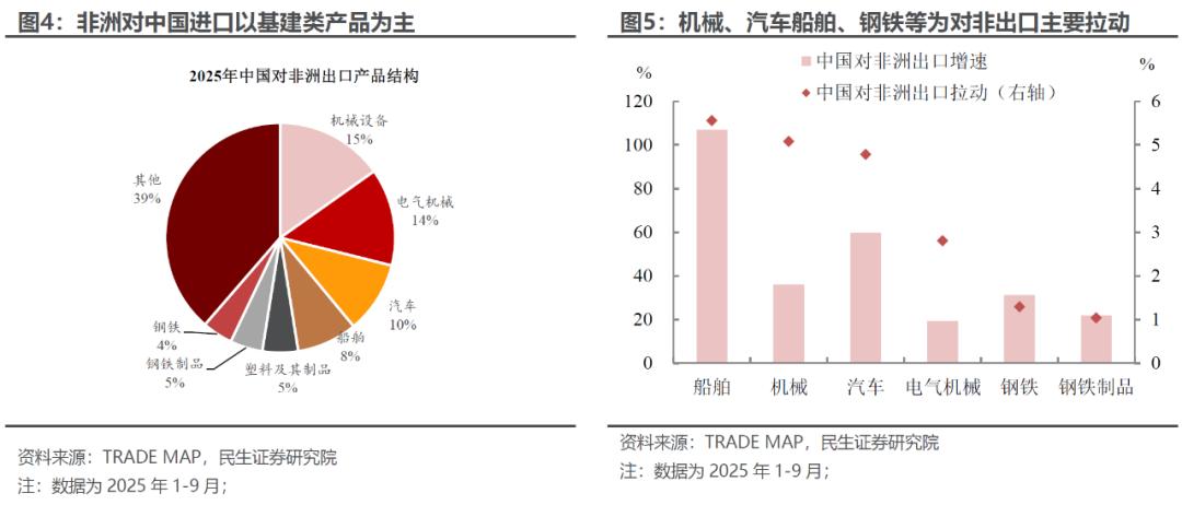从产品上,基建需求主导下,机电产品占非洲自华进口绝对比重。其中,机械设备、电气机械、汽车、船舶、钢铁及其制品等五类基建相关产品,占非洲自华进口机电产品的绝对比重(合计约55%),贡献了今年以来对非出口增速的75%,成为拉动出口的核心引擎。