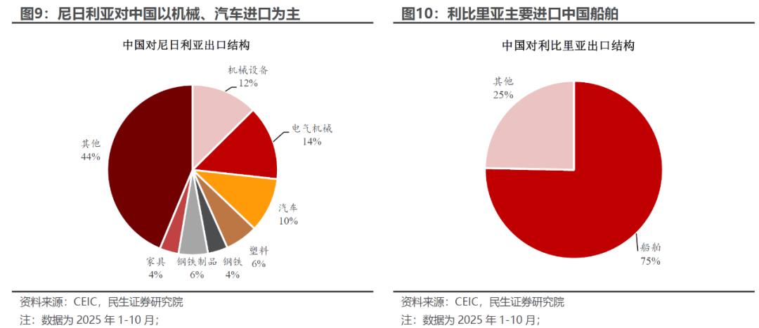 从国别上,非洲对华主要贸易伙伴进口明显分化,尼日利亚、利比里亚成为核心增长极。尼日利亚、南非、埃及、利比里亚和阿尔及利亚作为非洲对华前五大贸易伙伴,今年前10个月合计进口规模占非洲对中国总进口的45%,拉动非洲对华进口增速11%。但五国整体表现呈现分化态势,其中尼日利亚、利比里亚凭借基建与航运需求成为进口增长双引擎,但南非对华进口则显著放缓。