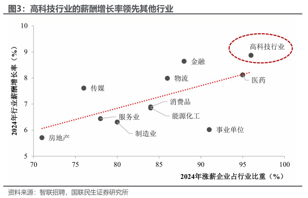 “高薪”岗位日益向科技与先进制造业集聚,“增收”的重心群体已然显现。虽然我国制造业占GDP比重高于多数主要经济体,但其从业人员收入比例却低于德国、日本、韩国等制造业强国。不过近年来,智联招聘数据显示高科技行业在薪酬增长上表现突出,印证了其在薪酬结构和就业质量上的引领地位。