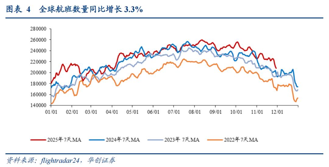 全球航班数量同比增长3.3%。截至11月28日,全球执行航班数量(7日移动平均)约21.1万架次,同比增长3.3%。前一周五约为22.17万架次,较去年同期增长8.5%。