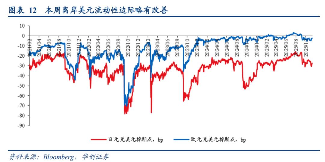 本周日元兑美元、欧元兑美元的掉期点小幅上行,离岸美元流动性略有改善。日元兑美元、欧元兑美元掉期点分别收于-27.25、-2.375pips,前一周分别为-29.635、-4.75pips。