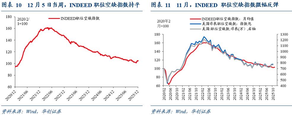 职位空缺数低位震荡。12月5日当周,INDEED职位空缺指数震荡,周度均值104.6,环比上周均值-0.0%。11月,INDEED职位空缺指数均值为103.1,高于10月均值102.1。