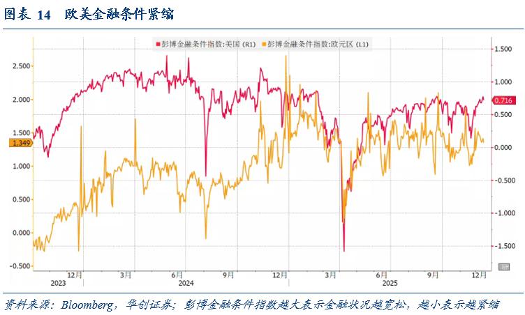 欧美国金融条件紧缩。12月12日,美国彭博金融条件指数为0.716,一周前为0.732,两周前为0.629。同期,欧元区彭博金融条件指数为1.349,一周前为1.455,两周前为1.237。