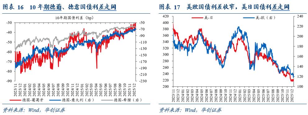 10年期美欧国债利差收窄,美日国债利差走阔。12月11日,10年期美欧国债利差为121.3bp,一周前为126.8bp。12月11日,10年期美日国债利差为220.7bp,一周前约为218.9bp。