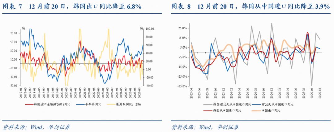 1、外需:韩国12月前20日出口同比、从中国进口同比均小幅回落。12月前20日,韩国出口同比降至6.8%,11月前20日为8.1%;但半导体出口同比仍然高升,12月前20日出口同比为41.8%,11月前20日为26.5%。12月前20日,韩国从中国进口同比降至3.9%,11月前20日为20%。