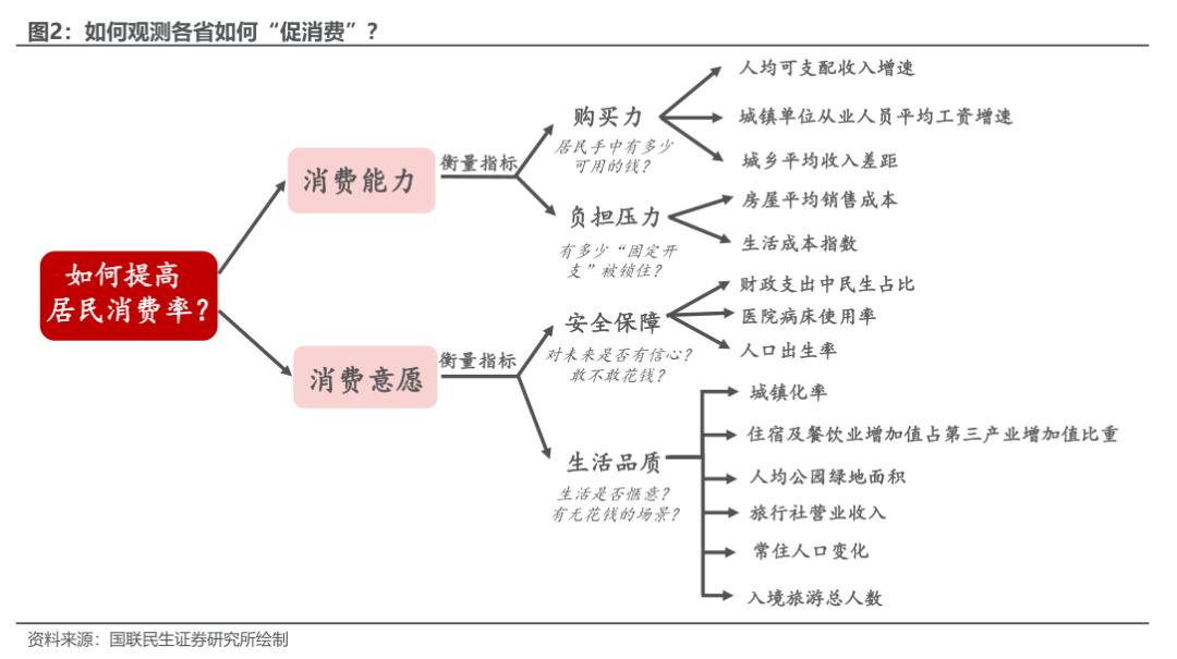 为何即便在相似的经济发展阶段,各省消费率却呈现显著差异?那些消费表现强劲的重点省份是如何“促消费”的?为了系统性剖析各省消费路径的成与败,我们可以结合各省多项指标表现、构建一个双维分析框架去一探究竟。具体来看,这些指标可以划分为两大类——一大类代表消费能力,关乎居民“能消费”的基础,可通过收入增速、房屋销售成本等指标衡量其购买力与支出压力;另一类代表消费意愿,关乎居民“敢消费”的环境,可通过民生支出占比、城镇化率等指标观察当地政府为居民提供的社会保障与生活品质。