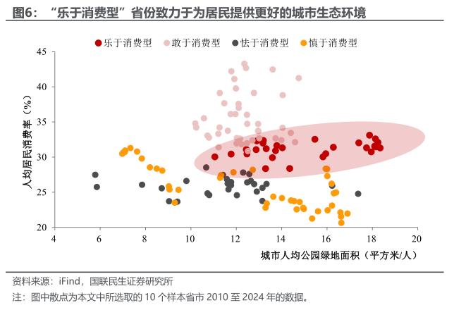 同时,“乐于消费型”省份的人均公园绿地面积在各类型中表现突出、位居前列。这不仅反映出当地对生态建设的投入,而且也能直接转化为居民日常生活中可感知的宜居环境,为促进消费提供了重要的生态支撑。