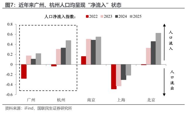 加快城镇化进程、营造宜居环境等措施,不仅提升了本地居民的生活品质,也显著增强了对外来人口的吸引力。近年来,身为省会城市的广州、杭州的人口均呈现净流入态势,为当地消费实力“添砖加瓦”。