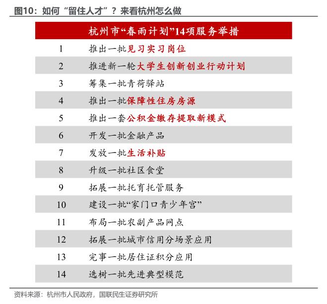 同时还注重从“吸引人才”到“留住人才”的闭环建设。更重要的是,从持续的人口净流入趋势来看,“乐于消费型”省份在“留住人才”方面同样表现优异。除了其突出的宜居环境之外,这些省份也通过控制生活成本、提供发展机遇等途径,有效回应了人才对“美好生活”的综合诉求。例如杭州为了留住人才、发布了“春雨计划”,通过14项服务举措让新市民和青年群体“进得来、留得下、住得安、能成业”。