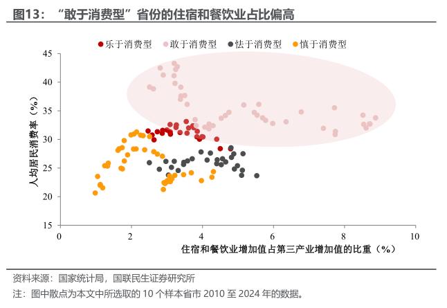 第三,“敢于消费型”省份的住宿和餐饮业增加值占比显著偏高,反映出其服务消费活跃、结构健康的特征。这一现象并非偶然,其背后是相对均衡的收入分配和扎实的民生保障共同作用的结果——居民在基本生活无虞后,更敢于将收入转化为即时的、体验式的服务消费。