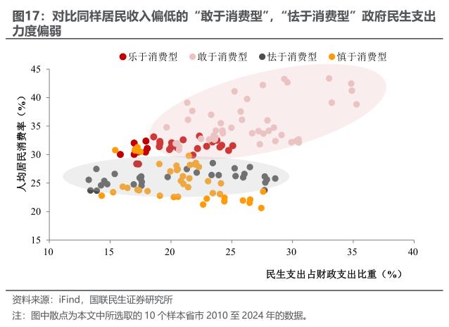 怯于消费型:着力提升“消费能力”,适当加强对“投资于人”的重视程度。对于“怯于消费型”地区,可以对标经济实力相似的“敢于消费型”、更多向增强居民购买力、减轻负担的“消费能力”入手。加大财政支出中投向民生的比例,同时将中央财政转移支付与特色产业培育相结合,有利于优先保障基本民生、促进就业增收,切实减轻居民负担,夯实可持续的消费能力基础。