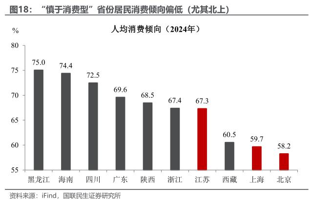(4)慎于消费型(对应人均可支配收入偏高、但消费率偏低的省市,如上海、北京、江苏等):在当地较高经济发展水平下,居民却更倾向于财富积累,消费表现理性克制。
