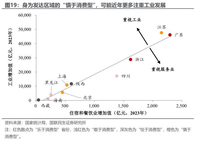 正是由于优先承担了“挑大梁”的工业与科技发展任务,“慎于消费型”省市对本地生活性服务业的投入相对有限,导致其住宿和餐饮业增加值占比显著偏低。这种结构性的供给失衡,使得消费场景较为单一、服务供给不够丰富,约束了居民消费需求的释放与升级。
