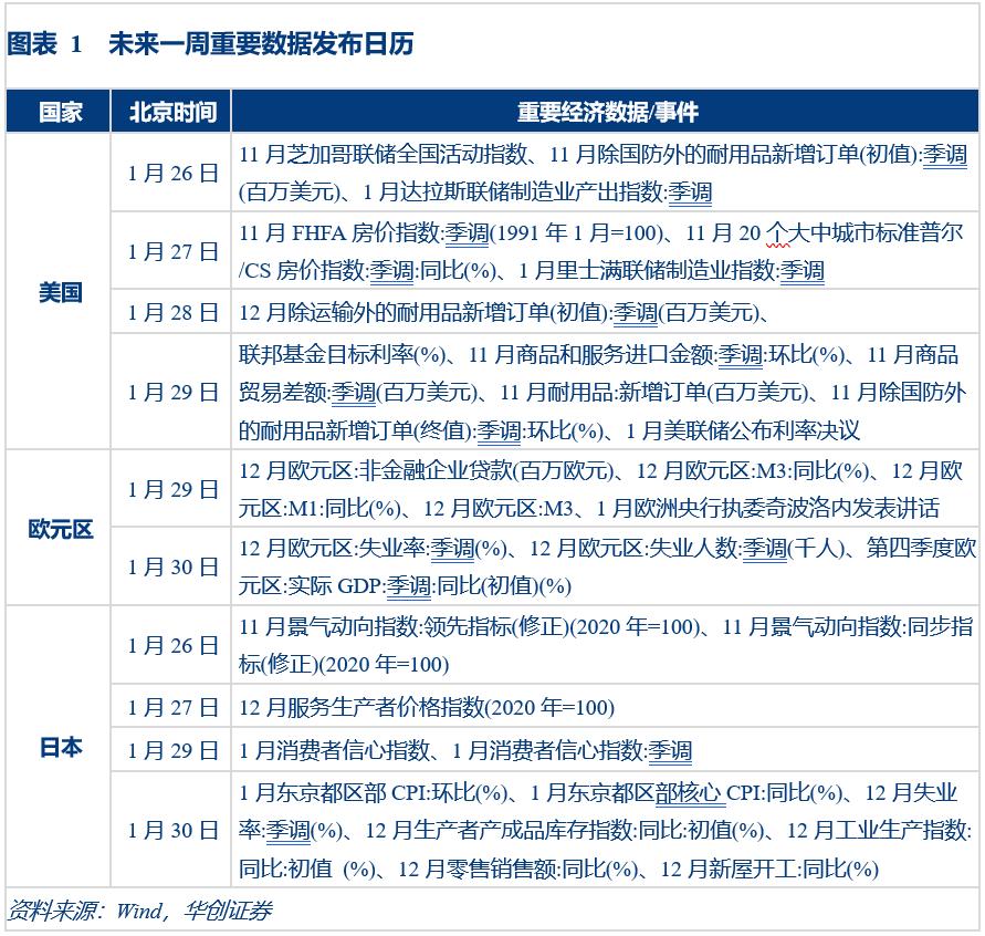 10年期美欧国债利差收窄,美日国债利差收窄。1月22日,10年期美欧国债利差为132.3bp,一周前为134.6bp。1月22日,10年期美日国债利差为202.1bp,一周前约为205.8bp。