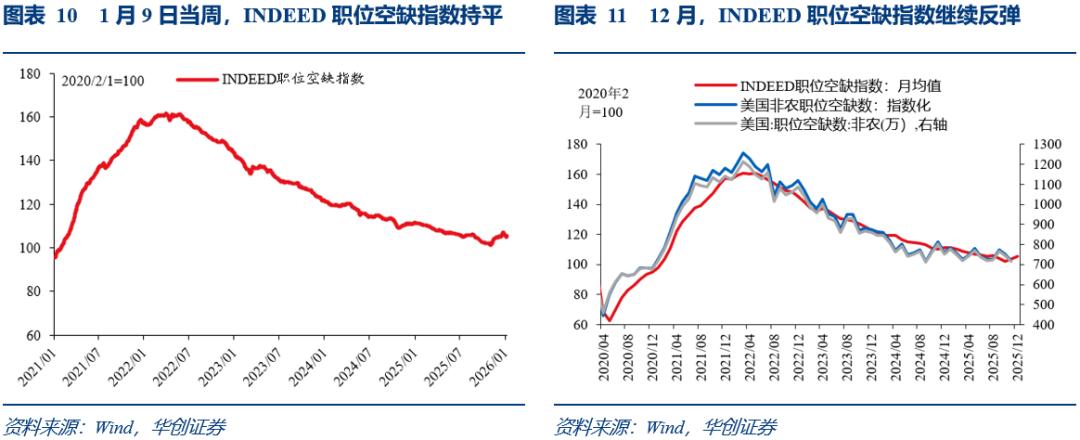 职位空缺数回落。1月9日当周,INDEED职位空缺指数回落,周度均值105.3,环比上周均值-0.5%。12月,INDEED职位空缺指数均值为105.6,高于11月均值103.3。